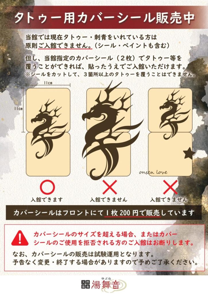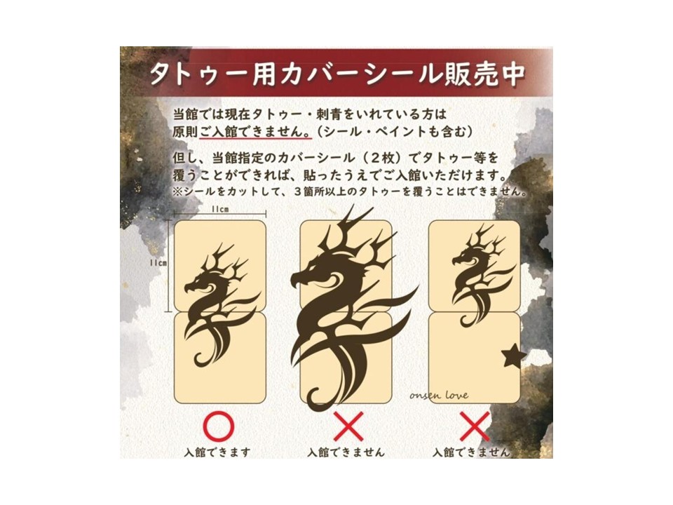 当館ではタトゥー・刺青を入れている方は原則ご入館いただけません。(シール・ペイントも) 2025.11.12 お知らせ 但し、当館指定のカバーシールをフロントでご購入していただき、覆うことができれば貼ったうえでご入館いただけます。